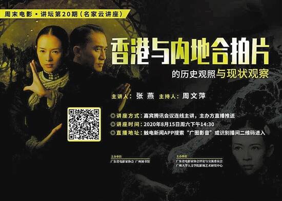 8月15日下午,由广东省电影家协会主办的周末电影讲坛举办《香港与内地合拍片的历史关照与现状观察》线上讲座,请来北京师范大学艺术与传媒学院教授张燕,剖析香港与内地合拍片的历史、现状与未来。