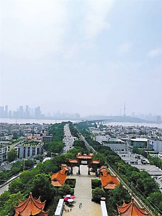 登上顶楼,俯瞰周围,武汉三镇尽收眼底。远眺长江的对面,龟山上的电视塔清晰可见,不禁想起毛泽东在畅游长江时写下的《水调歌头·游泳》中的词句:“风樯动,龟蛇静,起宏图。一桥飞架南北,天堑变通途。”如今,武汉三镇不仅是桥梁相连,更是地铁相通,交通非常便捷。