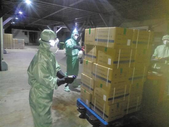白云山天心员工为湖北地区运来的药品原辅物料进行消毒