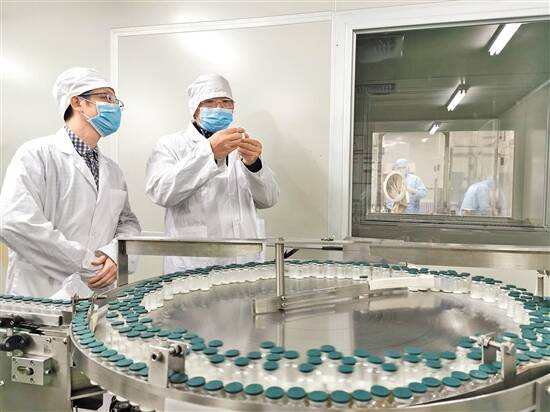 白云山天心副总经理谭胜连(右)带领一线员工把好产品质量关