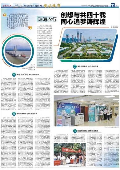 40年,实干笃行,蹄疾步稳;40年,风雨兼程,硕果累累。珠海经济特区的40年是一个辉煌的历程,更是一次伟大的出发,从新的起点扬帆再起航,珠海农行将凝聚起全行员工的智慧和力量,紧密围绕市委市政府的工作要求,在市人行、市银保监局的指导下,全面深化改革创新,全力以赴服务好粤港澳大湾区建设、珠澳融合发展等重大战略,为珠海经济和社会发展贡献更大的力量,书写无愧于新时代的篇章。