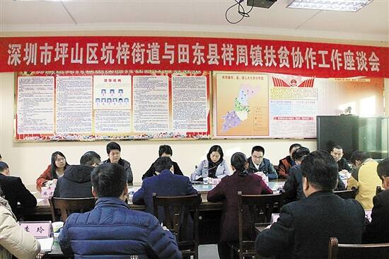 自2016年起,按照广东省、广西壮族自治区以及深圳市关于对口帮扶的工作要求,深圳市坪山区负责对口帮扶百色市田东县。2017年9月,坪山区坑梓街道与祥周镇签订结对帮扶框架协议。同年12月,坑梓街道结合辖区实际,由秀新社区、金沙社区分别与祥周镇陇造村、联合村签订结对帮扶协议,以点对点定向施策助力精准扶贫,引导扶贫干部“真扶贫”“扶真贫”,进一步聚焦扶贫政策落地见效。