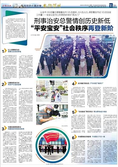 守土尽责,把好深圳“西大门”。宝安公安以扫黑除恶专项斗争为牵引,高压严打辖区违法犯罪,先后在人民关心的领域破获一批大案要案;以全区重点部位治安防控和屯警点武装值守为“点”,以深化“宝安义警”群防群治、交巡警深度融合为“线”,不断织密社会治安防控网。今年上半年,宝安区刑事治安总案情下降4.8%,再创历史新低,其中盗窃、入室盗窃、抢劫等重点警情大幅下降。社会治安持续向好,“平安宝安”再上新台阶。
