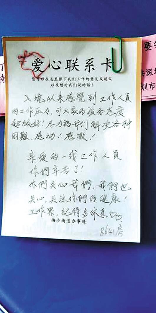 健康驿站中,住户写给工作人员的感谢小纸条