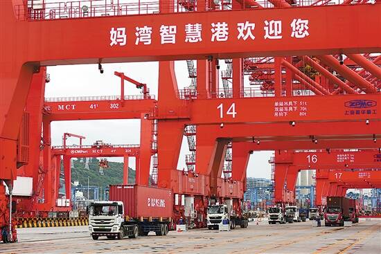 2020年8月19日,妈湾智慧港进入测试作业阶段,5G技术应用的无人驾驶货柜车在港区穿梭(见上图)。