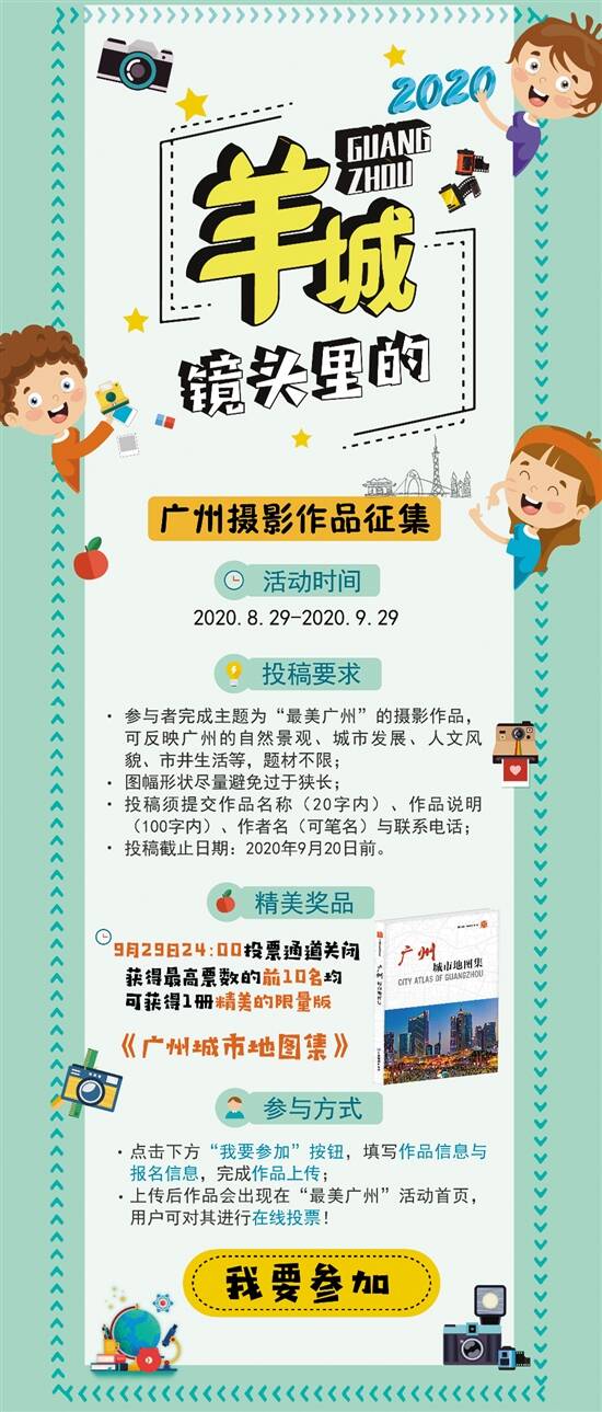 在发现美丽的同时,可以拿起手机拍摄你心中最美的羊城,不管是自然景观、城市发展、人文风貌、市井生活的主题皆可投稿,只要在9月29日24:00保持在线人气票数最高的参赛选手,就可获赠精美限量版《广州城市地图集》,快快参与,火速报名吧!
