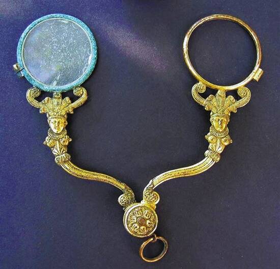 从18世纪后半叶至19世纪初叶,“剪刀眼镜”也很流行,就是把两个镜片分别安装在两个镜片架上,两个镜片架的末端像剪刀那样铆在同一个轴上,不使用时折叠在一起,使用时打开手持使用。法国皇帝拿破仑·波拿巴(1769年-1821年)就使用剪刀眼镜。