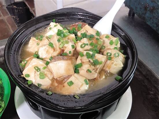 三、煎煮豆腐:热锅冷油,豆腐入锅。煎至定型后加适量水用中火慢煮约10分钟,快熟的时候用南薯粉加水和适量的酱油搅拌后勾芡,再转入砂煲撒上葱花或剁碎的芹菜。