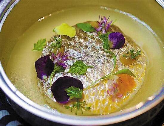 鱼子酱卤水鹅肝是“跃”的招牌菜,大厨选用法国鹅肝,用潮州卤水方式做成鹅肝酱,在其表面铺上鱼子酱,同时还用分子料理手法点缀了几颗貌似鱼子的意大利黑醋珠子。食客品尝时,鱼子酱的咸鲜让鹅肝酱的卤水味更加出彩,而意大利黑醋珠子轻轻咬破后,又暗合了潮菜卤水要蘸醋的传统习惯,整个品尝过程可谓妙不可言。