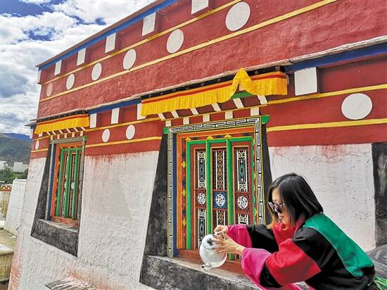 每年秋冬时节,乡城的民众都要为自己的藏房施行“灌礼”。从功能性角度而言,白色灌礼类似于对藏房外墙的粉刷,能够使墙体更加美观、防雨。但在当地人看来,白色灌礼还具有重要的文化意义。据说,每一次白色灌礼就相当于点上一千盏酥油灯、诵一千道平安经。因此,“白色灌礼”更是当地民众对于吉祥和幸福的祈求,寄托着他们对美好生活的向往。