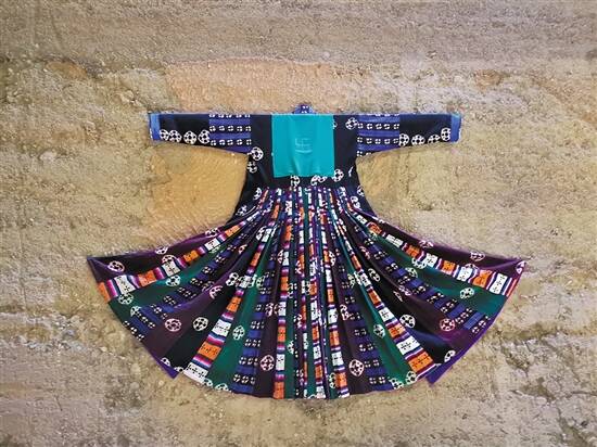 “疯装”是乡城当地妇女的特色民族服装,与白色藏房、桑披岭寺并称为“乡城三绝”。疯装的第一个特点是裙摆折叠的褶皱多,内折、外折共计108个褶皱,对应着佛教中的108颗佛珠;第二个特点是色彩运用大胆而夸张。其左右胸襟镶有红、黄、绿、黑、金五块三角形丝绒布料,分别代表着福寿、土地、先知、牲畜和财富,也表达着当地居民的美好愿望。
