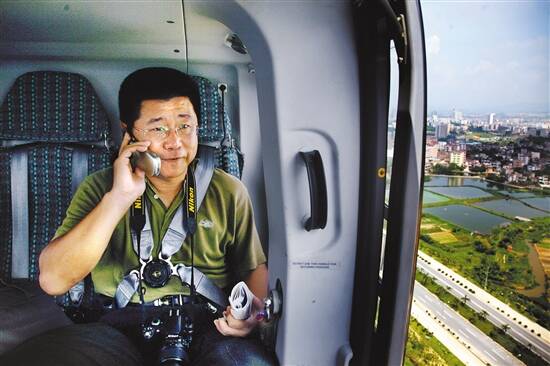 2007年,为报道九江断桥突发事件,刘海陵与羊城晚报摄影记者登上直升机采访。图为刘海陵在直升机上用移动电话现场发稿 羊城晚报记者 陈秋明 摄