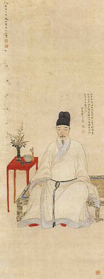 明代有不少传世的画像,人物身旁的装饰,多配一花几,花几上面摆放花瓶、香炉等饰物,用来暗示被画对象的品味和雅好。如北京故宫博物院所藏明万历沈俊绘《钱应晋像》轴。画像主人坐旁摆放着一座红木花几,上面窄小的空间摆放着一只插满鲜花的花觚、箸筋瓶、哥釉开片蚰耳香炉连座以及香盒。故宫所藏另一轴万历士中所绘的《李流芳像》手执如意、意态闲暇的李流芳坐旁,有张长条石案,石案的后方摆着一只带座白瓷方形花觚,里面供养着灵芝兰草。觚旁放着一只青铜三足鼎炉和一个朱漆香盒。李流芳是明代著名诗人画家,生活于万历崇正年间,而方形或海棠式正是万历年间开始流行的瓶型,出现在画像之中,充满时代气息。