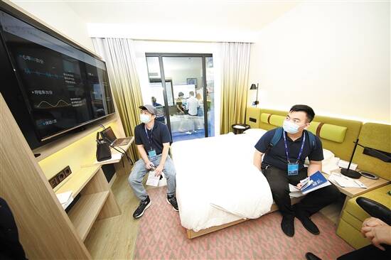 记者在现场看到,该公司用模块化建筑技术为一家国际知名连锁酒店建造的客房,被整体搬进了高交会展馆。走进室内,映入眼帘的舒适设计和高品质装饰会让人瞬间仿佛已在高端酒店现场。除模块内展示走廊、卧室、浴室等功能外,模块外立面也展示了中集模块化建筑特有的幕墙技术和箱体连接技术。智能家居设备如睡眠监测、智能魔镜、智能体脂秤等,实时监测健康数据也都应有尽有。
