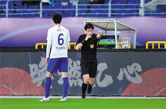 山东鲁能对河北华夏首回合,主裁判艾堃观看VAR后作出判罚 新华社发