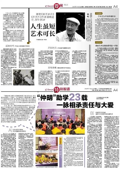 对潘鹤来说,羊城晚报承载了他太多的回忆和情感。潘鹤生前一直有剪报的习惯,他不仅会剪自己在羊城晚报发表的作品,还会将他觉得有意蕴的文章或画作也剪下,以供收藏。“当时的羊城晚报在广州的呼声很高,可以说是那几代人特有的文化烙印。”潘鹤当时告诉记者,羊城晚报对他来说,更是一种特殊的抒发途径。自羊城晚报创刊以来,潘鹤的诗、书、画作品多次在报上发表,“羊城晚报这个平台,让文学家和艺术家有了一个抒发心声、宣泄情感的地方”。