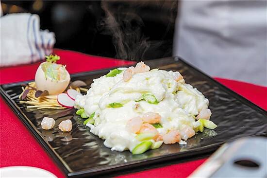 做这道菜的关键是要把握好蛋清与牛奶的比例,通常是4:6,加少量面粉是点睛之笔,目的是让牛奶更滑、有弹性。炒的时候手一定要稳,切忌用大火,否则牛奶就会失去晶莹剔透的特点。