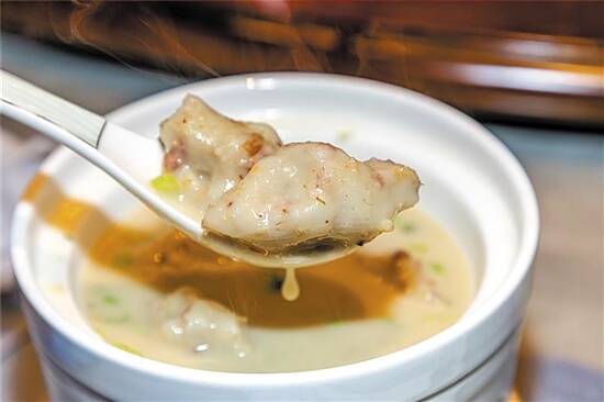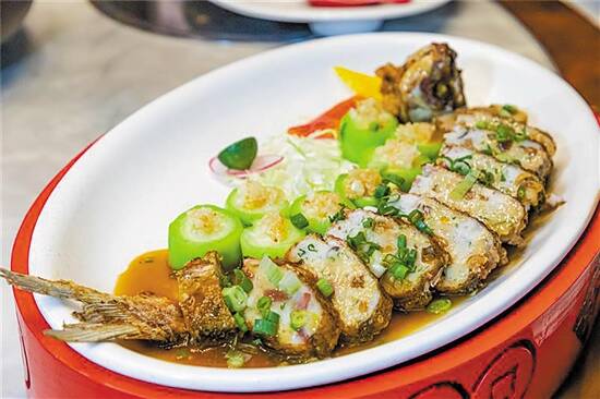 在广州番禺香江酒店便有这道市桥香煎酿土鲮鱼,餐厅主厨介绍,制作时鱼皮与鱼肉分离以及打鱼滑的过程都非常关键,如果鱼皮分离不完整,这条鱼就会报废。虽然制作过程有点复杂,但番禺百姓却热衷于把这份饱含心意与情谊的美味与亲友分享。