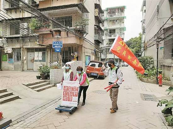 刘玉兰(中)与党员志愿者走街串巷宣传防疫知识