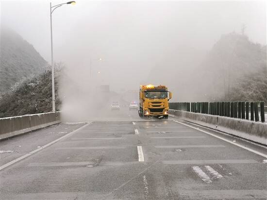 羊城晚报讯 记者张文,通讯员冯进富、邱红岩、华铜摄影报道:受较强冷空气南下影响,粤北地区近段时间气温骤降。16日凌晨5时许,京港澳高速粤境北段(京珠北)梅花至云岩段测得最低温一度接近-4℃,云望大桥、雾观大桥路段应急车道有薄冰现象。16日上午,省高速公路公司京珠北分公司出动“狂风吹雪车”,清除应急车道结冰路段积冰。
