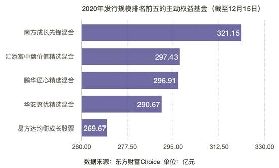 具体来看,主动权益基金发行总规模超过1.5万亿元,占据基金发行的半壁江山,近100只主动权益基金采用按比例配售,25只基金发行规模超过百亿元。其中,南方成长先锋发行规模为321.15亿元,汇添富中盘价值精选、鹏华匠心精选、华安聚优精选等基金的发行规模也逼近300亿元,易方达均衡成长股票、富国创新趋势等基金的发行规模也均在100亿元以上。