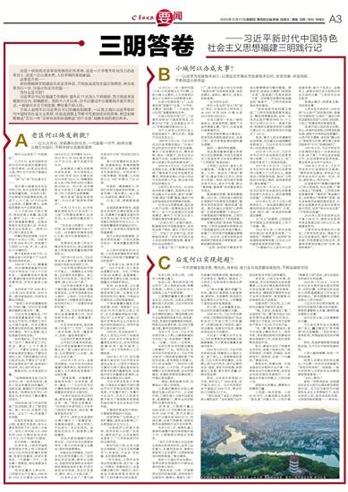 三明人始终牢记习近平总书记的嘱托和期望,一以贯之践行习近平新时代中国特色社会主义思想,在前进道路上不断书写更加优异的答卷,树立起统筹推进“五位一体”总体布局和协调推进“四个全面”战略布局的地方样本。