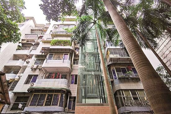 透明玻璃面墙的加装电梯成为老旧小区一道靓丽的风景