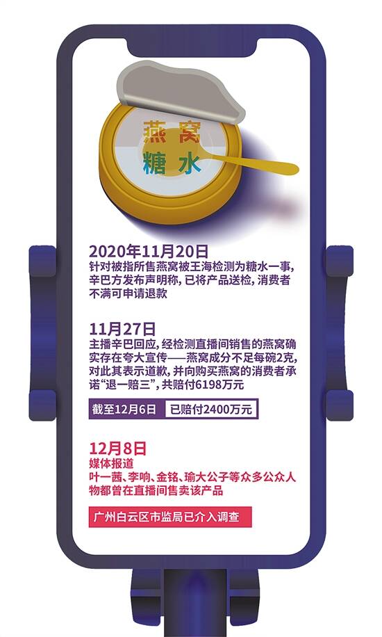 快手电商发布“关于‘辛巴直播带货即食燕窝’事件的处置公告”显示,此前快手已全站下架该品牌燕窝产品,封禁“时大漂亮”账号电商功能14天;要求该主播所属和翊公司负责人辛有志(别名“辛巴”)妥善处理售后问题,积极配合相关部门调查,辛有志个人账号于11月17日起暂停直播。