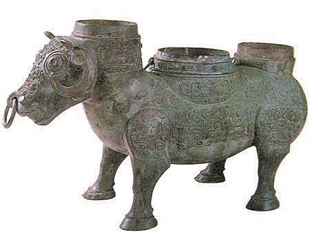 出土于山西省浑源县李峪村一座晋国墓地的青铜牛尊,这是一只驯化牛,鼻环鲜明,肩峰处被巧妙地做成容器