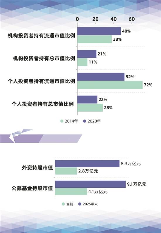纵观行情,研究机构普遍表明,2021年市场机构化趋势将持续走强,A股市场将继续呈现结构分化形态。据中信证券最新预计,到2025年末,公募基金的持股市值将从当前的4.1万亿元提升到9.1万亿元,占比提升至8.7%;同时,外资持股市值或将从当前的2.8万亿元提升到8.3万亿元,占比提升至8%。