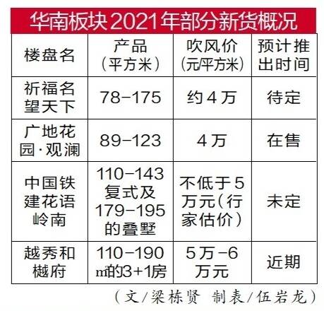 华南板块目前在售的一手楼盘主要有广地花园·观澜、祈福名望天下、中国铁建花语岭南和越秀和樾府等,产品涵盖两至五房的平层、复式、叠墅等多类产品,选择多元。