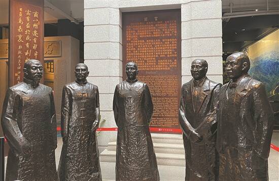 香山商业文化博物馆里的一组粤商铜像,最中间是郑观应,另从左至右分别为徐润、唐廷枢、马应彪、郭乐