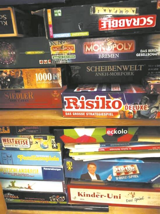 德国人的家里,几乎都有一个或多个柜子的游戏玩具,这些玩具大多是成人与孩子可以共同玩的,像我家就有3个放游戏玩具的柜子。有叫“世界旅行”的游戏,这是几个人玩的,是以某个国家为基地,通过互相算计的游戏手段,比谁最先到达目的地。有叫“百万富翁猜谜”的游戏,是一种知识问答,它模仿电视的猜谜回答得分。还有叫“银行家”的游戏,是银行投资和理财的游戏,让孩子或大人动脑筋做买卖或投资,这个游戏里有被罚款等细节。