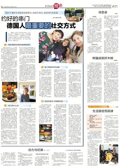 早先德国男人们工作,女人不上班,所以周末就是女人串门的日子。常常几个男人约好了到一个朋友家打牌,这通常是喝下午茶的时间。相应地,太太们也就随之相聚。男人在餐厅圆桌打牌的时候,女人们就围在客厅里一起喝咖啡,吃点心、聊天。有时聊得热闹了,就喝点葡萄酒,甚至弄点烧烤,干脆一直到夜里。