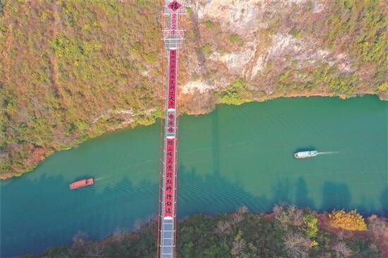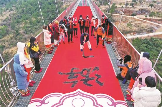 羊城晚报讯 记者陈强、通讯员曾令华摄影报道:长168米、宽5米的巨幅春联在世界最长玻璃桥亮相!1月29日,在获得世界最长玻璃桥吉尼斯纪录的广东连州擎天玻璃桥上,清远书法家手持大笔书写巨幅春联迎接新年,给留在广东过年的市民送上祝福。