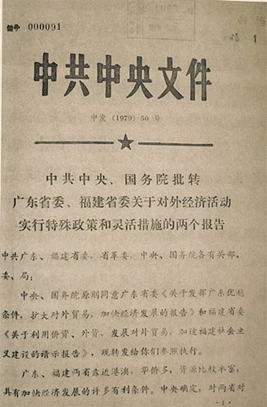 为了落实两省实行特殊政策、灵活措施和试办出口特区事宜,中共中央书记处书记、国务院副总理谷牧带领工作组到广东、福建同两省领导一起研究起草文件。5月11日,谷牧率领工作组到广东,就实行特殊政策、灵活措施的必要性、经济体制改革要解决的若干问题做了重要指示。6月6日,省委常委会同意向中央上报《关于发挥广东优越条件,扩大对外贸易,加快经济发展的报告》。7月15日,中共中央、国务院批转广东省委、福建省委关于对外经济活动实行特殊政策和灵活措施的两个报告(即中发[1979]50号文件)。据文件,中央确定,“对两省对外经济活动实行特殊政策和灵活措施,给地方以更多的主动权,使之发挥优越条件,抓住当前有利的国际形势先走一步,把经济尽快搞上去”。文件还同意广东在深圳、珠海、汕头试办“出口特区”。