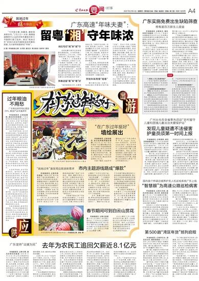 羊城晚报讯 记者徐振天、实习生钟婧萍摄影报道:2月3日,以“在广东过年挺好”为主题的墙绘作品在广州地铁5号线杨箕地铁站F口展出,吸引众多市民乘客驻足观看,为市民增添在粤过年的欢庆气氛。据悉,墙绘作品由广州本土街头艺术家完成,展出时间将延续到3月2日。
