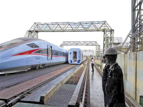 羊城晚报讯 记者袁增伟,通讯员刘毓林、易世麟摄影报道:2月2日9时30分许,火车轮渡“粤海铁4号”装载着一组CR-300AF型复兴号动车组,从广东省徐闻铁路北港开往海南省海口铁路南港。广东湛江海事部门加强现场检查,服务保障动车组运输安全。