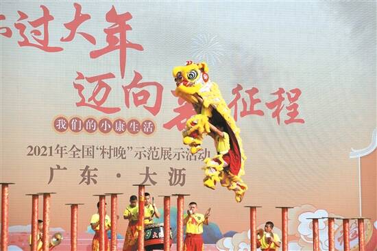 羊城晚报讯 记者黄宙辉,通讯员王姣、关艳娟、刘成摄影报道:龙狮舞动、粤剧折子戏、少儿街舞……4日下午,“欢乐过大年·迈向新征程”——我们的小康生活2021年全国“村晚”示范展示活动(广东·大沥)在佛山大沥镇九龙公园广场举行,为全国观众奉上一台精彩的广东特色“村晚”。