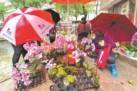 10日(年廿九),广州下起大雨,但西关街头仍年味十足,花档有不少街坊撑着伞来买花 晓明 摄