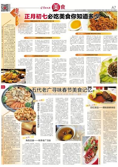 自汉朝开始,“人日”节俗初现,魏晋后逐渐被重视。旧时,在广府人心中,“人日”的重要性不亚于除夕和开年。这一天,人们会戴“人胜”登高赋诗,而不同区域的人在这一天也会烹饪不同的“必吃佳肴”予以庆祝,如七宝羹、长面条、七样菜等。随着时代变迁和物质水平的不断丰富,“人日”习俗和与之相关的传统美食也在不断演变和发展。