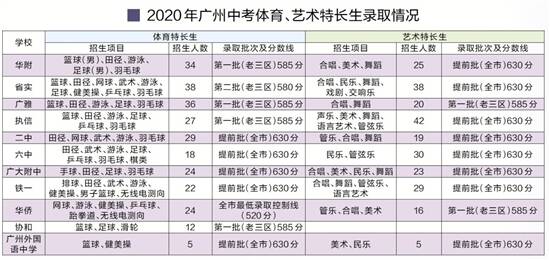 艺术特长生方面,以2020年广州市录取情况为例,华南师范大学附属中学、广东实验中学和执信中学为全市提前批,录取分数为630分;广东华侨中学录取分数线为第一批(老三区)分数线585分。其余学校艺术特长生与体育特长生录取批次相同。