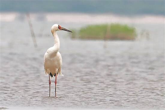 白鹤是一种大型涉禽,体长125厘米-140厘米。成鸟站立时通体白色。迁徙时经华东和华北,中途只在大型湿地短暂停栖,补充能量。主要越冬于长江中游,最大的越冬种群位于江西鄱阳湖,少量越冬于长江下游至东南、华南地区。目前,全球的白鹤仅存4000多只,被世界自然保护联盟评估为极危物种,在中国列为国家一级保护野生动物。