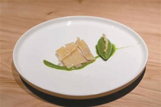 广东人常说“无鸡不成宴”,“跃”的姜葱白切鸡最大特点莫过于把传统姜葱蘸料做成雪芭。吃的时候将姜葱雪芭厚厚地均匀涂抹在白切鸡上,送入口中,温热的鸡肉和冰凉的姜葱形成温度差,姜葱的味道变得柔和,更能突出鸡肉原本的鲜味。