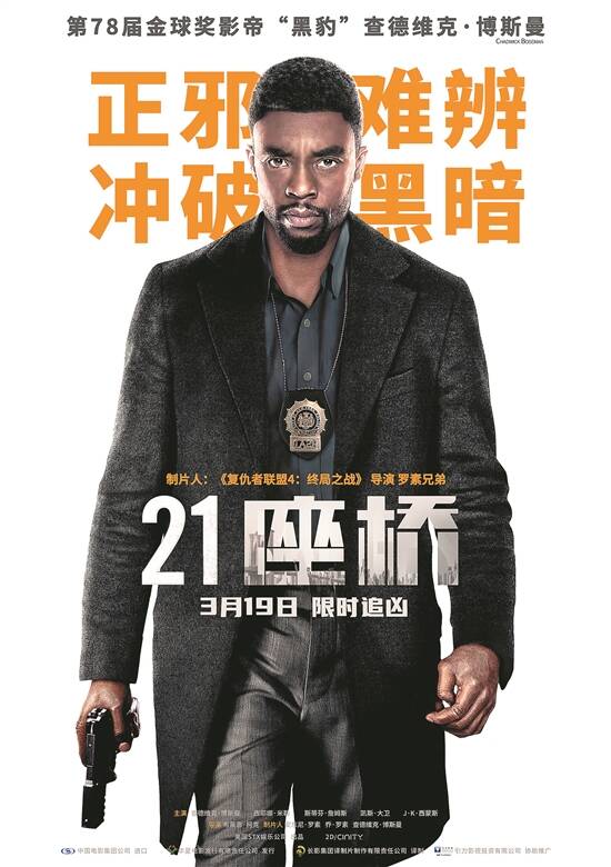 3月4日,电影《21座桥》曝光预告片,宣布内地定档3月19日。该片由刚刚斩获金球奖最佳男主角的“黑豹”查德维克·博斯曼主演,这也是他生前的最后几部作品之一。