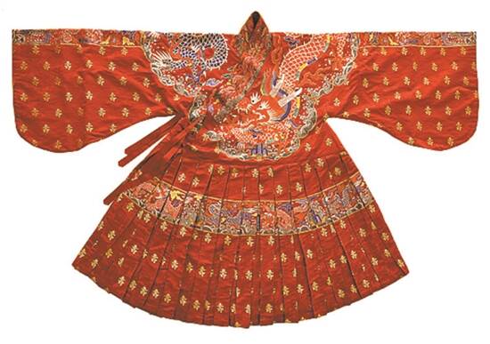 明万历织金寿字龙云肩通袖龙栏妆花缎衬褶袍(十三陵复制版)
