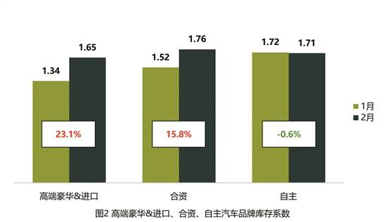 数据显示,2月高端豪华&进口品牌库存系数为1.65,环比上升23.1%;合资品牌库存系数为1.76,环比上升15.8%;自主品牌库存系数为1.71,环比下降0.6%。