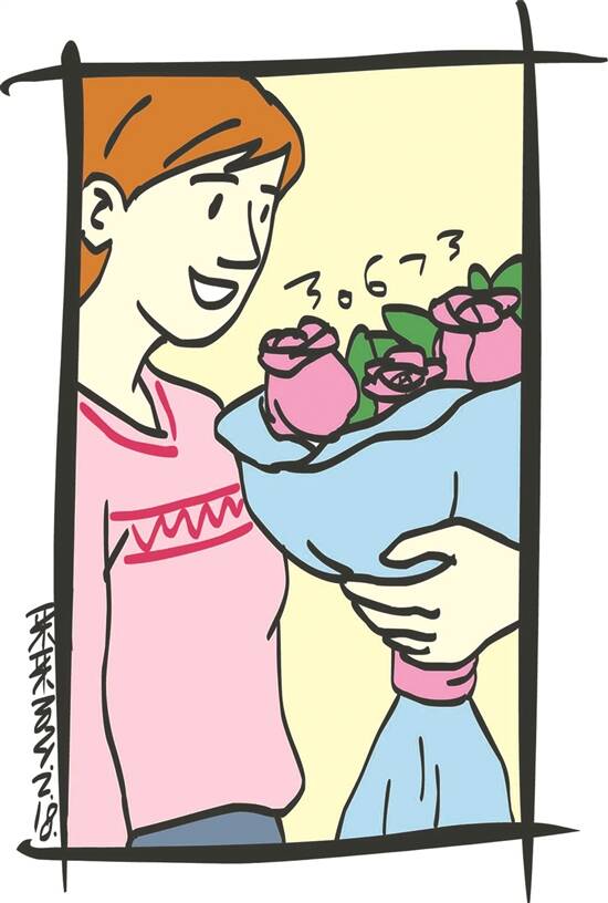 第二天,女孩刚开门,一束玫瑰花出现在眼前,女孩看到玫瑰花后面的脸,一愣:“张宇?”张宇心如撞鹿,紧张地问女孩:“我们一起过年,好吗?我……我喜欢你……”女孩心口一跳,脑回抽地来了句:“你中奖了?”张宇哭笑不得,说:“你关注的重点是不是偏了?”女孩的脸腾地一下又红了。 (熊燕)