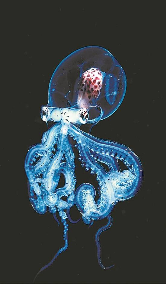 以玻璃章鱼为例。它们的身体几乎全透明,除了消化系统、视神经和眼睛可见之外。而为了更完美隐形,它们的眼睛也进化得相当有特色——不是那种普通的大大的圆眼睛,而是一种被拉长的管状眼睛。这样结构的眼睛虽然会损失部分视觉,却能最大限度地减小在阳光下投射的影子,从而更不容易被下方的掠食者发现。而且研究者发现,玻璃章鱼一直都是直立向上地游动,这应该也是为了尽可能地减小身体投射到海底的影子。