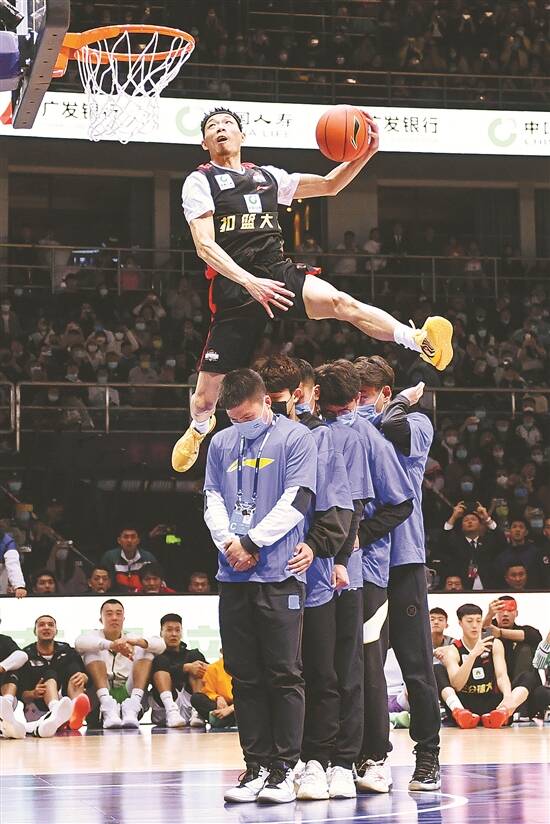 陈登星飞越五人的换手胯下暴扣 新华社发